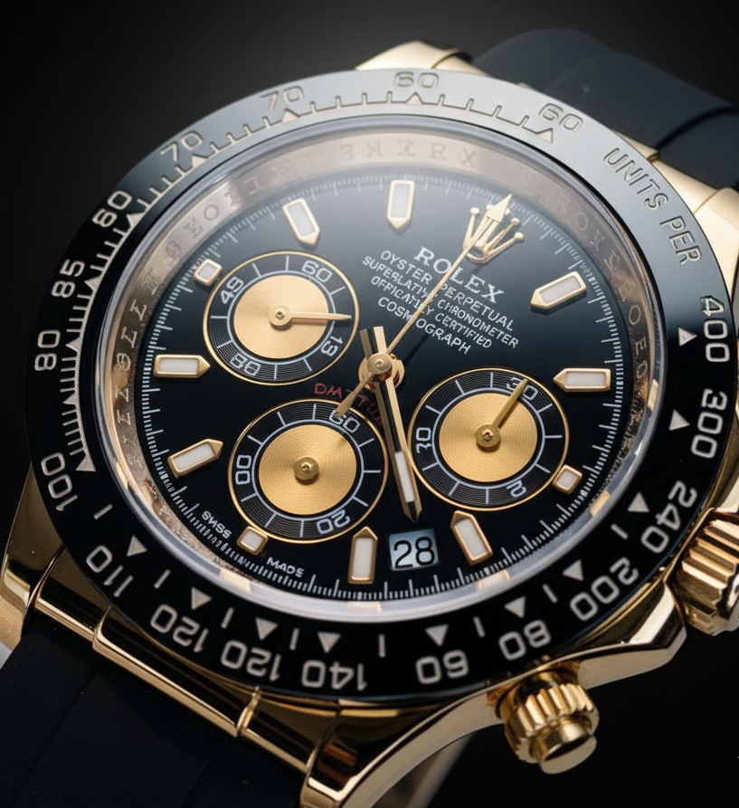 Be the first to review “Classy Type RLX Daytona Rose Gold Black Belt Watch”